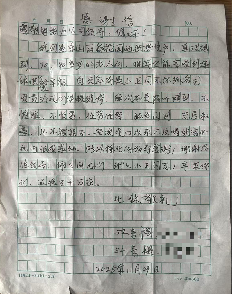 11月29日,東山麗都花園小區(qū)兩位年逾八旬的老奶奶親筆寫下飽含真摯情誼的感謝信,并專程送至公司。信中真摯寫道:“感謝小王同志,感謝昌樂熱力公司的領(lǐng)導(dǎo)!是你們的辛苦付出,讓我們在冬天里住得暖和、心里踏實!”其中一位老人動情感慨,未曾想晚年能享受到如此貼心周到的集體關(guān)懷,內(nèi)心滿是感動。這封滿載暖意的感謝信在鄰里間廣泛傳閱,讓這份寒冬里的溫情故事傳遞給更多人,也讓昌樂盛源熱力有限公司的暖心服務(wù)贏得了居民的廣泛贊譽(yù)。